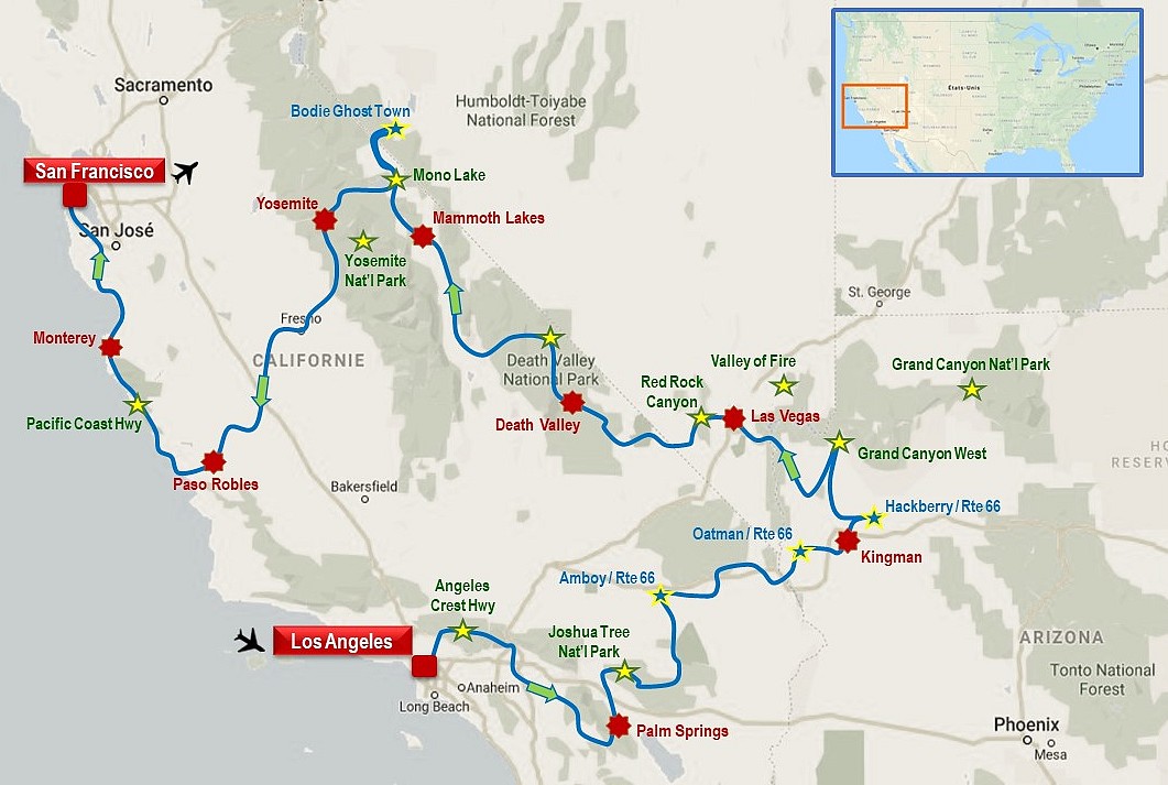 Au départ de Los Angeles, à vous les routes californiennes ! Des tracés mythiques, à l'image de la Rte 66 et ses lieux improbables, tels le Hackberry General Store, ou encore de la Tioga, de la Pacific Coast Hwy, et bien évidemment, des parcs et sites emblématiques que sont Joshua Tree, Death Valley, Grand Canyon, Las Vegas, Yosemite, Big Sur, ou San Francisco. Un voyage inoubliable qui prendra fin sur le Pacifique, à San Francisco, la plus cosmopolite et la plus attachante des villes de l'Ouest.