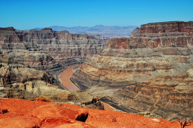 Cap ensuite sur le Grand Canyon West, en territoire indien Hualapai. Le Grand Canyon a été creusé par le Colorado et s'étend sur 450km, entre Vegas et le Lake Powell. L'attraction majeure du site est le 'Skywalk', une passerelle en verre qui surplombe le 'rim' (accès payant). L'autre attraction consiste à effectuer un survol en hélicoptère dans le canyon (différentes formules).