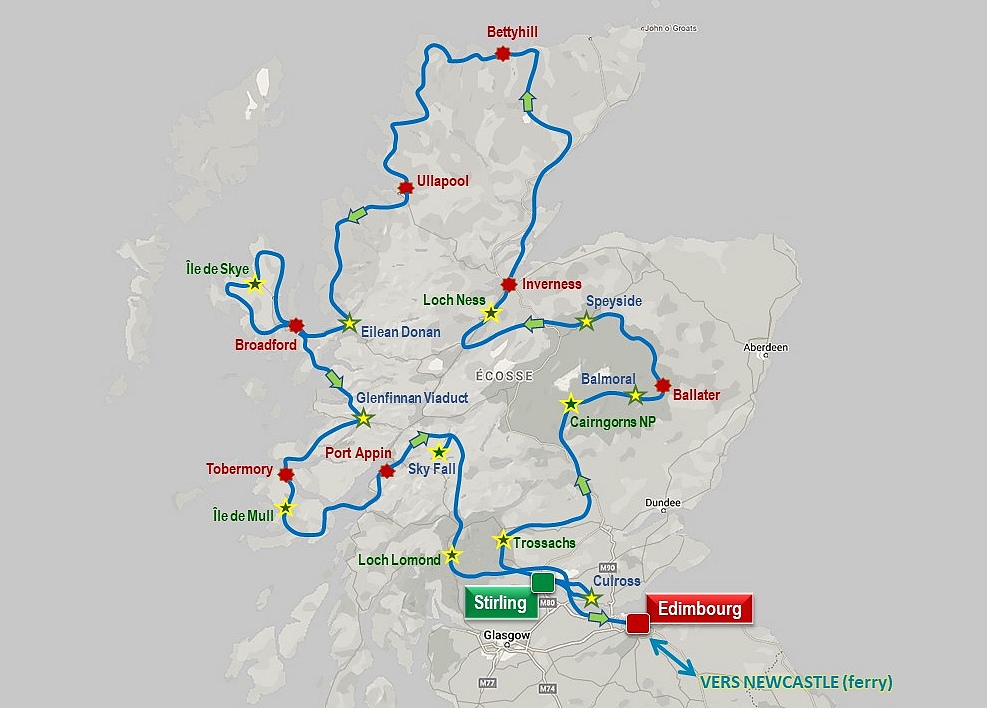 Cap sur l'Ecosse, pour un périple extraordinaire au pays des Lochs, des Clans, des châteaux, de Harry Potter, et des purs malts ! Après une traversée en ferry de nuit, cap sur Stirling, les Trossachs, le parc national de Cairngorns, le Speyside, puis Inverness et le Loch Ness. Direction les Highlands et la route North Coast 500, avant la magnifique île de Skye et sa voisine de Mull, dans les Hébrides Intérieures. Après la Sky Fall Rd, chère à James Bond, cap sur Edimbourg, avant le retour en ferry.