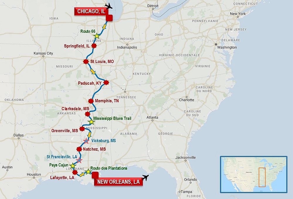 Un itinéraire haut en couleurs, en saveurs et en rythmes, autour de la Route du Blues, sur les traces de Robert Johnson, BB King & Co. Au départ de Chicago, sur les rives du lac Michigan, cap sur la Rte 66 en Illinois & Missouri, avant St-Louis, Memphis, Clarksdale & ses clubs mythiques dans le Delta du Mississippi, puis Natchez, le pays Cajun, la Route des Plantations de Louisiane ! Fin du périple à La Nouvelle Orléans, la belle et bouillonnante Créole.