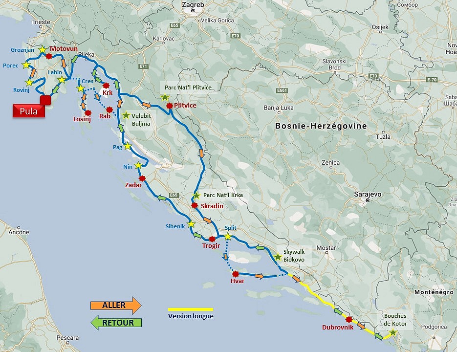 Le choix est tout aussi vaste... Même si, pour limiter le nombre de km à parcourir et le temps de voyage, Il est conseillé de débuter / finir à Pula (c'est l'option que nous vous présentons ci-dessous). Vous pourrez par exemple y rejoindre d'autres participants qui auront choisi l'avion et la location de moto sur place...