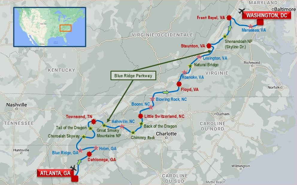 Un périple de rêve sur les plus belles routes de l'Est, au départ d'Atlanta. Après les adorables bourgades du nord de la Géorgie, cap sur les Great Smoky Mountains, qui abritent l'un des plus beaux parcs nationaux américains, entre Tennessee et Caroline du Nord. La région est réputée pour ses routes mythiques : Cherohala, Tail of the Dragon, Blue Ridge Parkway... La Skyline Drive, dans le parc national de Shenandoah, en Virginie, annonce l'arrivée à Washington, capitale des Etats-Unis.