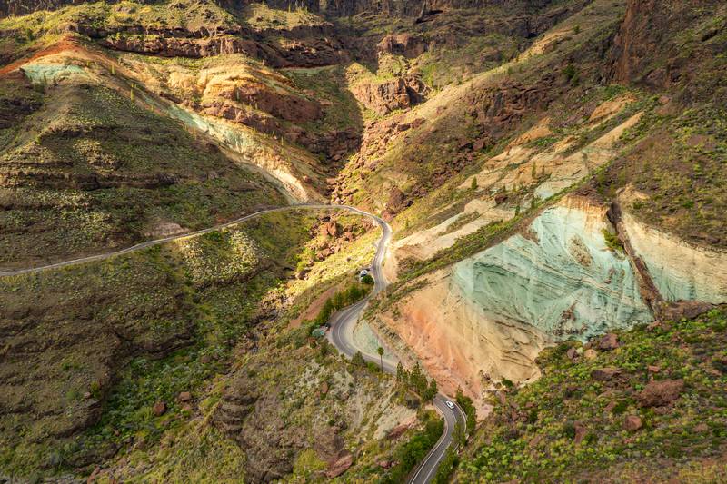 Tous les motards le savent : le paysage et le plaisir de piloter se renouvellent même lorsqu'on inverse le sens de roulage ! Cap sur Veneguera, un paradis caché sur Gran Canaria. Après les fameux 'Azulejos', roches aux teintes multicolores, façon 'Artists Palette' à Death Valley, la balade dans les ruelles de ce petit village est un vrai bonheur, avec ses maisons en pierre et ses balcons traditionnels du 18ème.